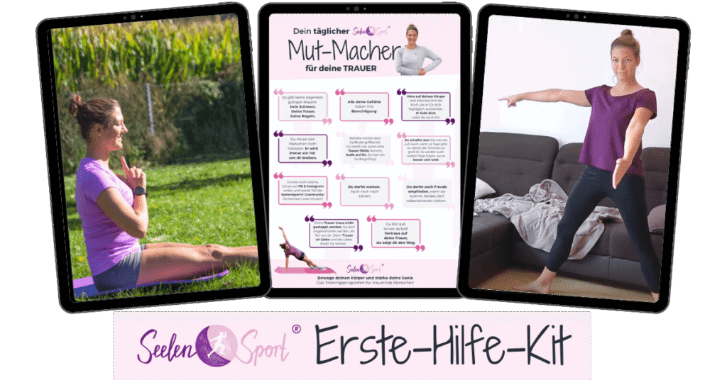 Hole dir 2 Körperübungen als Videoanleitung aus dem SeelenSport® Programm und einen Mutmacher für den Notfall, wenn die Trauer dich wieder einmal überrollt!